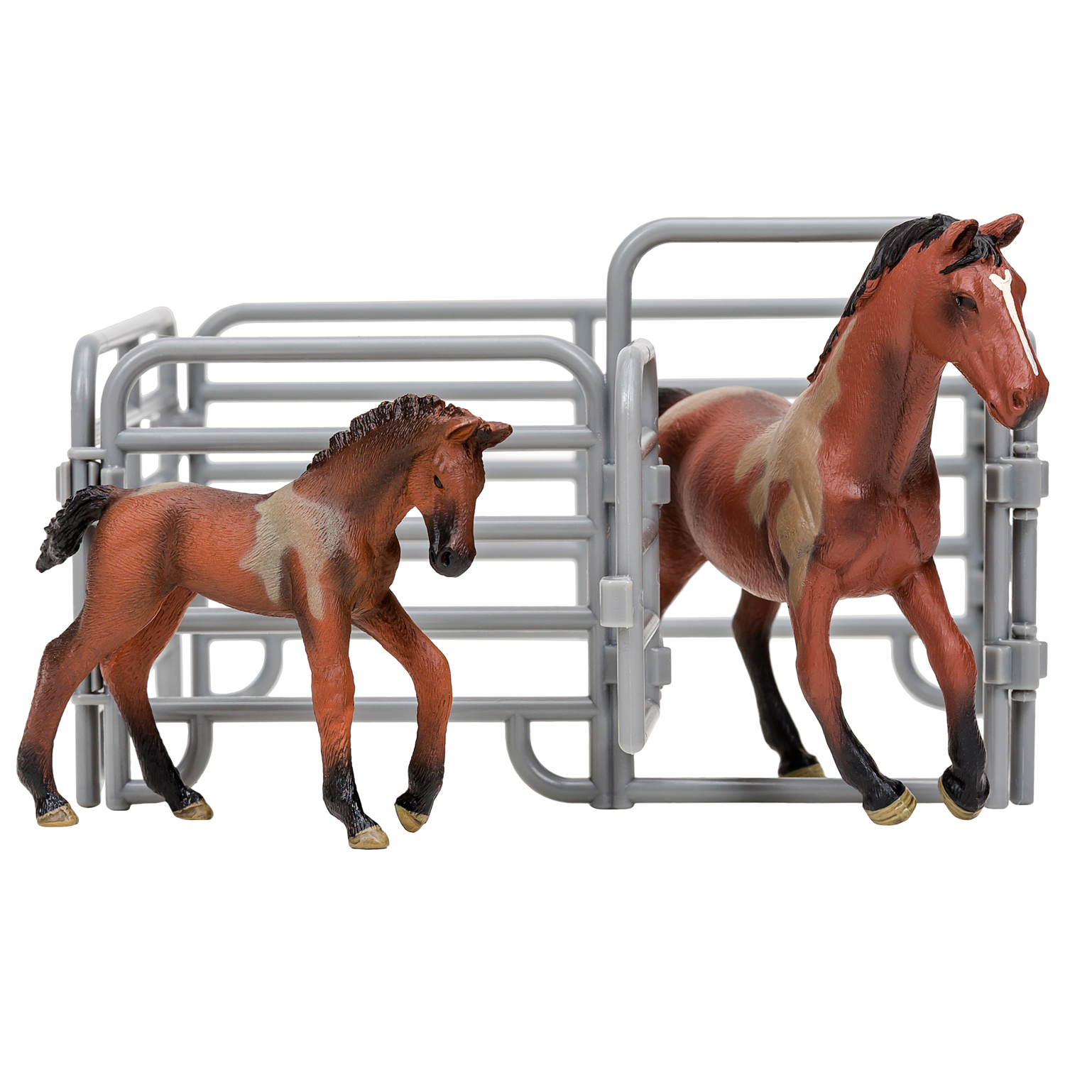 • В комплект входят: лошадь (16х4х11 см), жеребенок (10х2,5х9 см), загон (10х15х15 см).