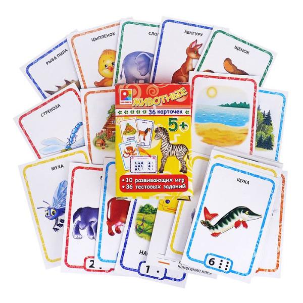 Развивающие карточки для занятий и игр, которые помогут закрепить знания о животных и проверить уровень подготовки к школе с помощью заданий на обороте.