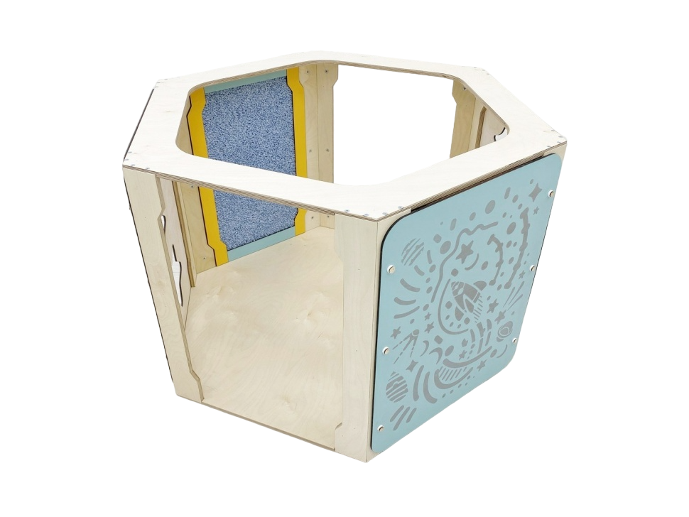 Внутри модули украшены тактильными панелями для развития сенсорной чувствительности, а снаружи – лазерной гравировкой и фигурными окошками.