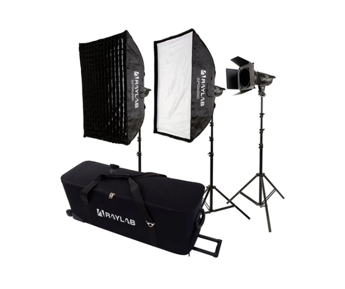 В комплект входят три моноблока мощностью 300Дж каждый, два стандартных 7-дюймовых рефлектора, три стойки 2,6м с воздушной амортизацией, два прямоугольных софтбокса с сотами,